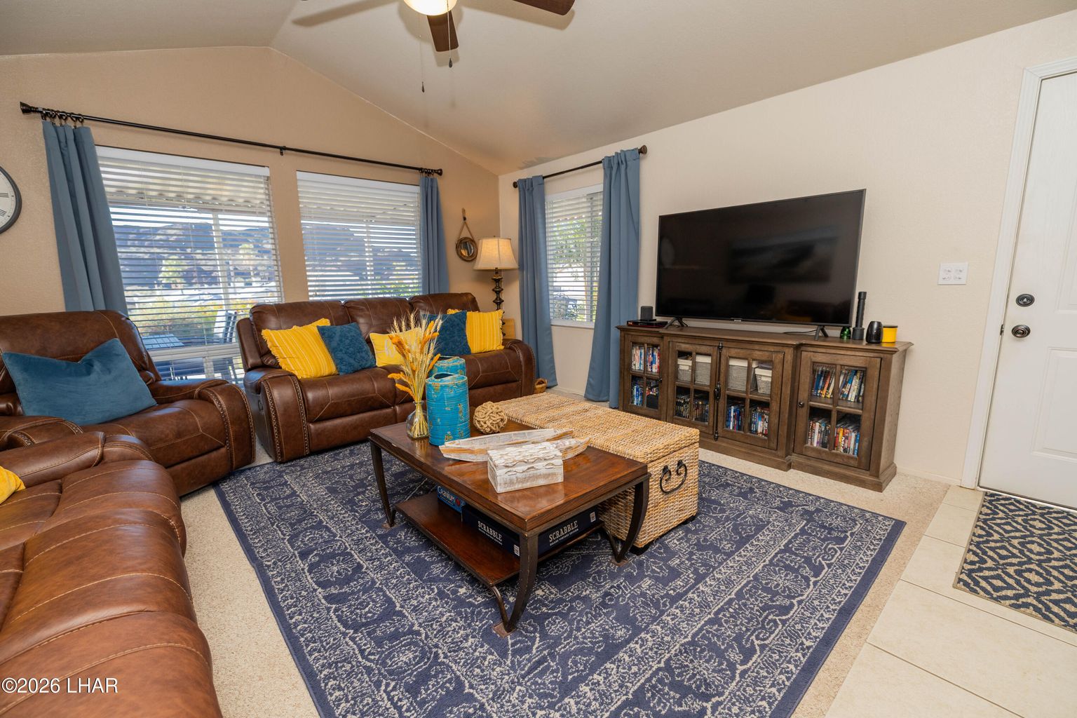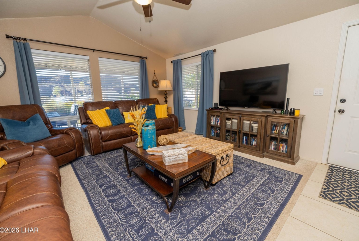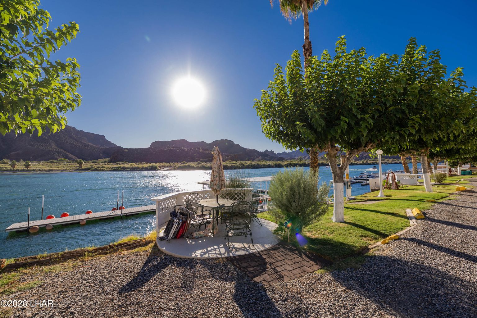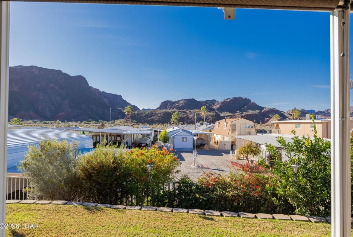 On leased land. No HOA fees. Enjoy your days and nights from the patio of this beautifully maintained and furnished home, offering vaulted ceilings with ceiling fans in each room, indoor laundry area with newer appliances, and a well-appointed kitchen offering plenty of storage, a gas range/oven and a built-in beverage bar/pantry. The large, detached garage has room for the water/desert toys and the toolboxes. The community has a shared dock and green areas and is located close to launch ramps for the Colorado River and Lake Havasu. Start enjoying the ”River Life” without paying a fortune!