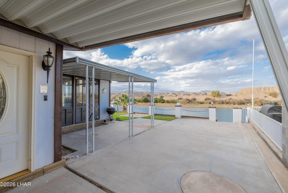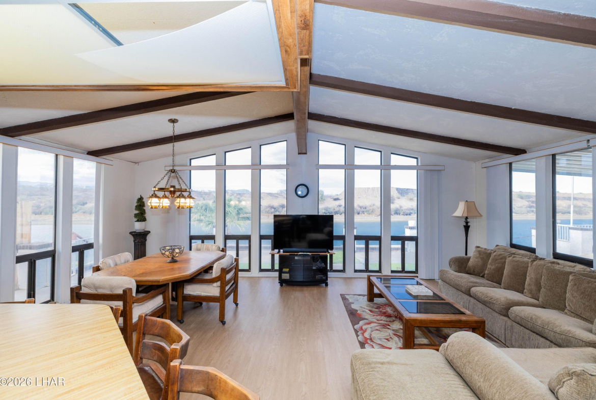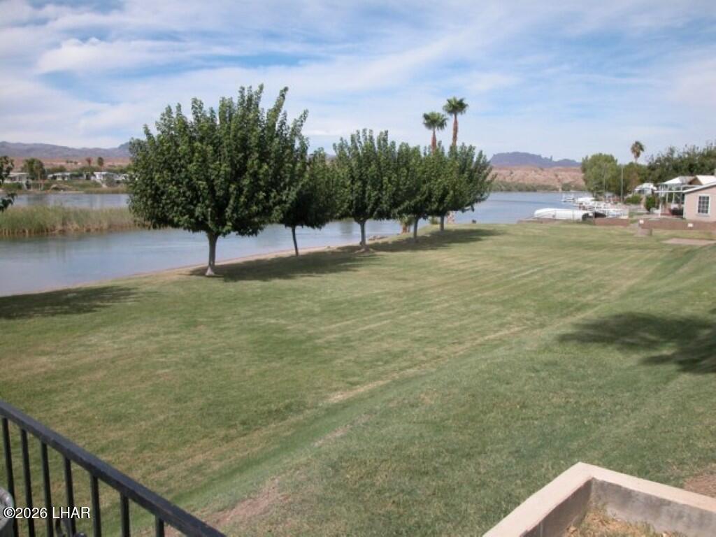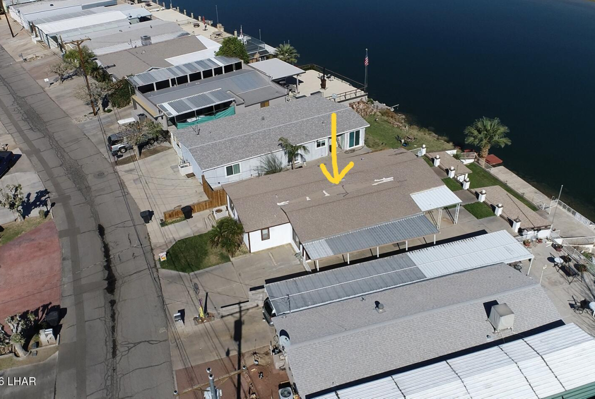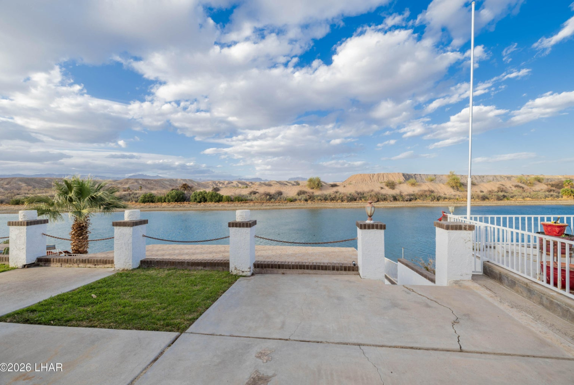On leased land, this riverfront home offers stunning views of the river and mountains to enjoy from the floor to ceiling windows in the living room or from the two covered riverfront patios. Over 1900 square feet of living space this home comes completely furnished! An inviting open floor plan, spacious living room that is light and airy (and did I mention the views!), a wet bar with pool table makes it a perfect place for friends and family to gather and have fun after a day in the sun on the 60 foot private dock! Also included is a jet ski pad for easy river access, a dock to tie the boat up to and fish from and a utility room on the lower patio to store all your river gear! This home is in a gated community with amenities that include a club house, beach area, boat launch ramp, swimming pool and several common areas on the banks of the Colorado River!! No HOA and no property tax!! New AC installed in May of 2025.