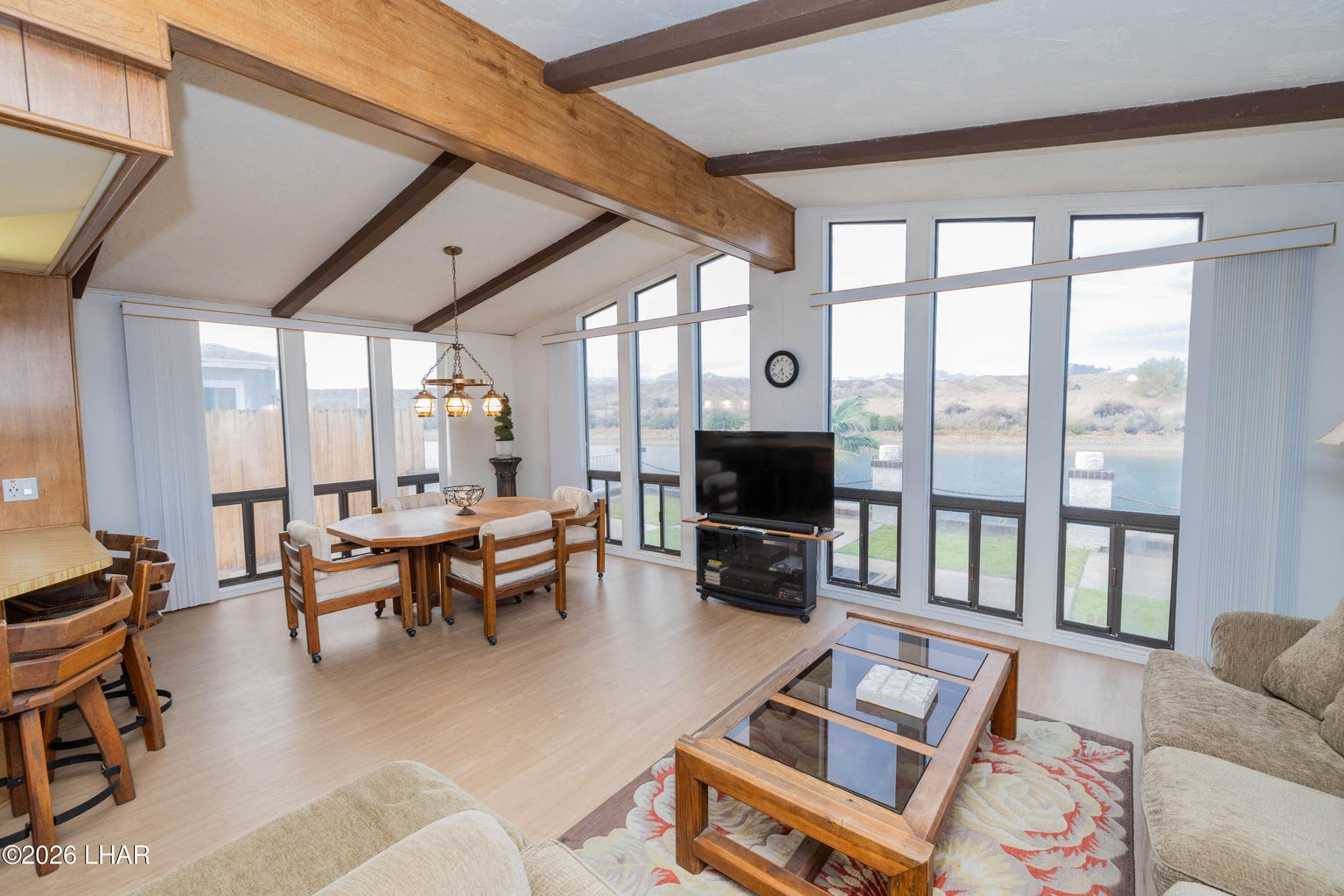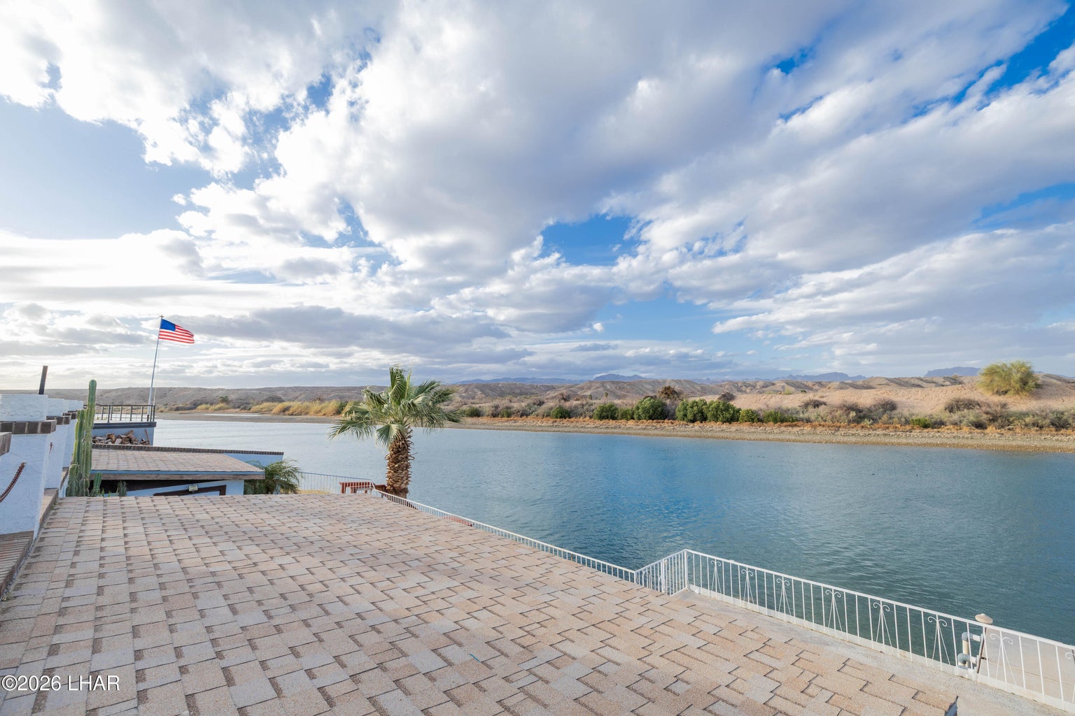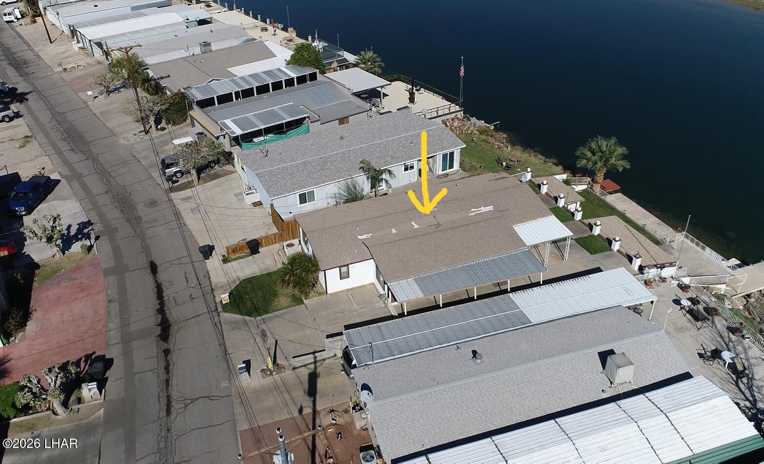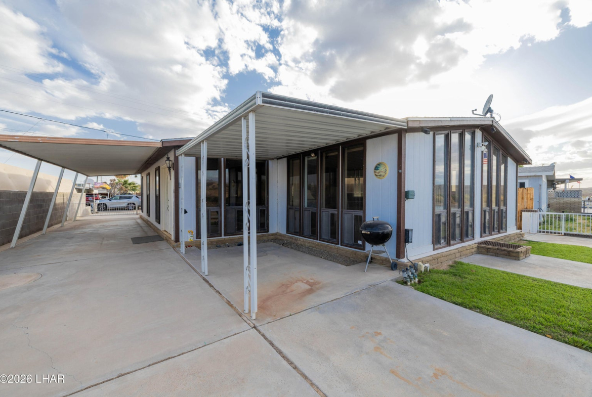 On leased land, this riverfront home offers stunning views of the river and mountains to enjoy from the floor to ceiling windows in the living room or from the two covered riverfront patios. Over 1900 square feet of living space this home comes completely furnished! An inviting open floor plan, spacious living room that is light and airy (and did I mention the views!), a wet bar with pool table makes it a perfect place for friends and family to gather and have fun after a day in the sun on the 60 foot private dock! Also included is a jet ski pad for easy river access, a dock to tie the boat up to and fish from and a utility room on the lower patio to store all your river gear! This home is in a gated community with amenities that include a club house, beach area, boat launch ramp, swimming pool and several common areas on the banks of the Colorado River!! No HOA and no property tax!! New AC installed in May of 2025.