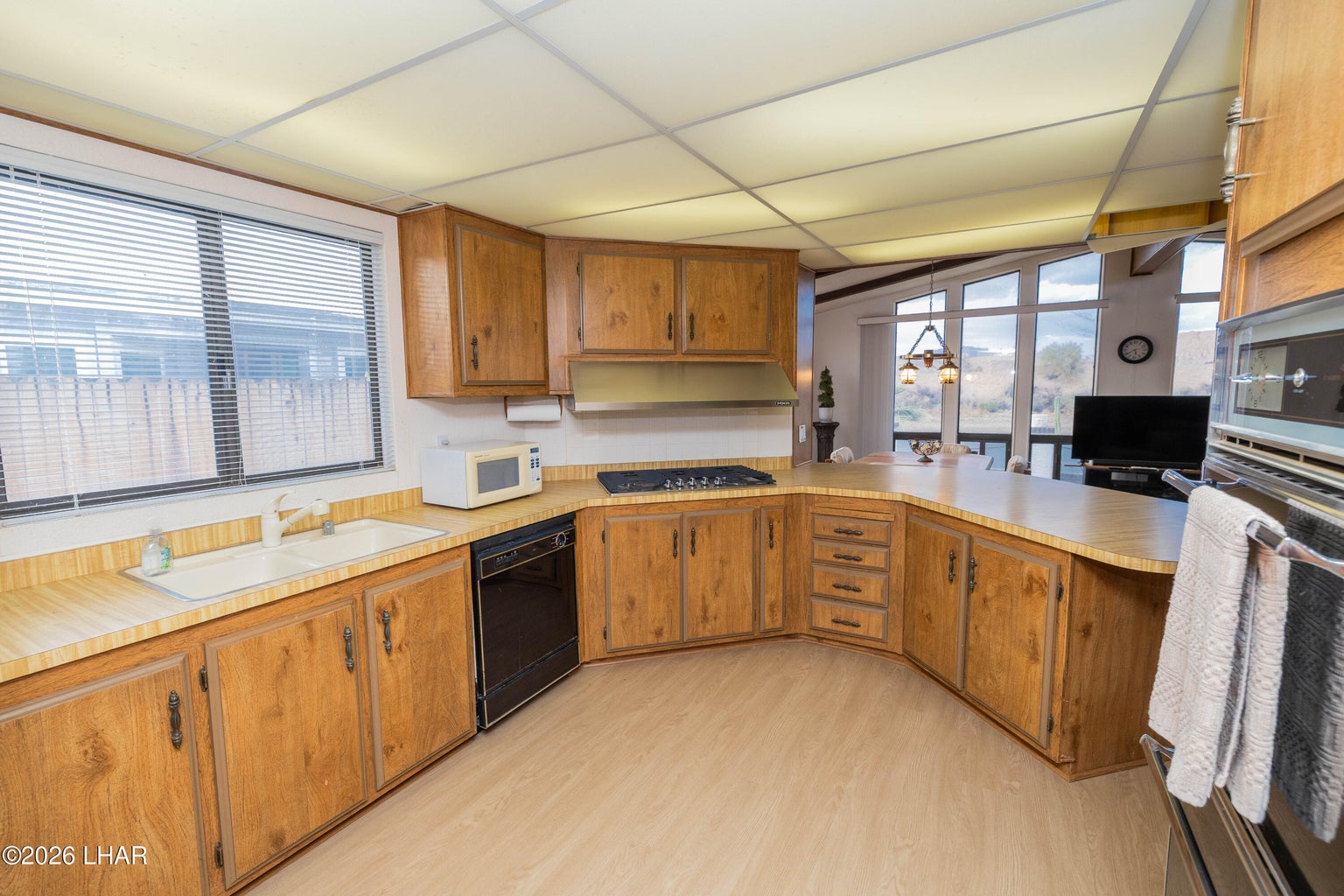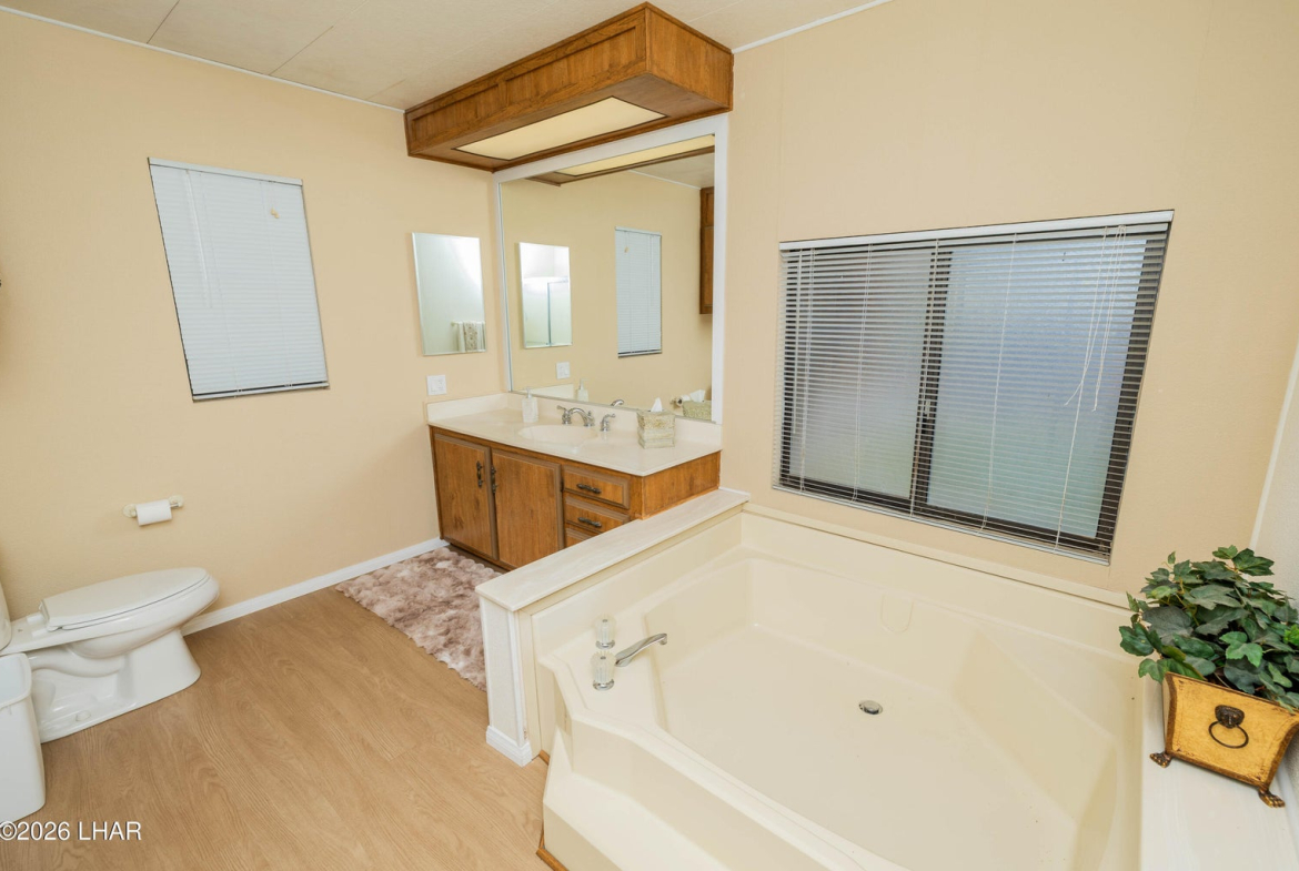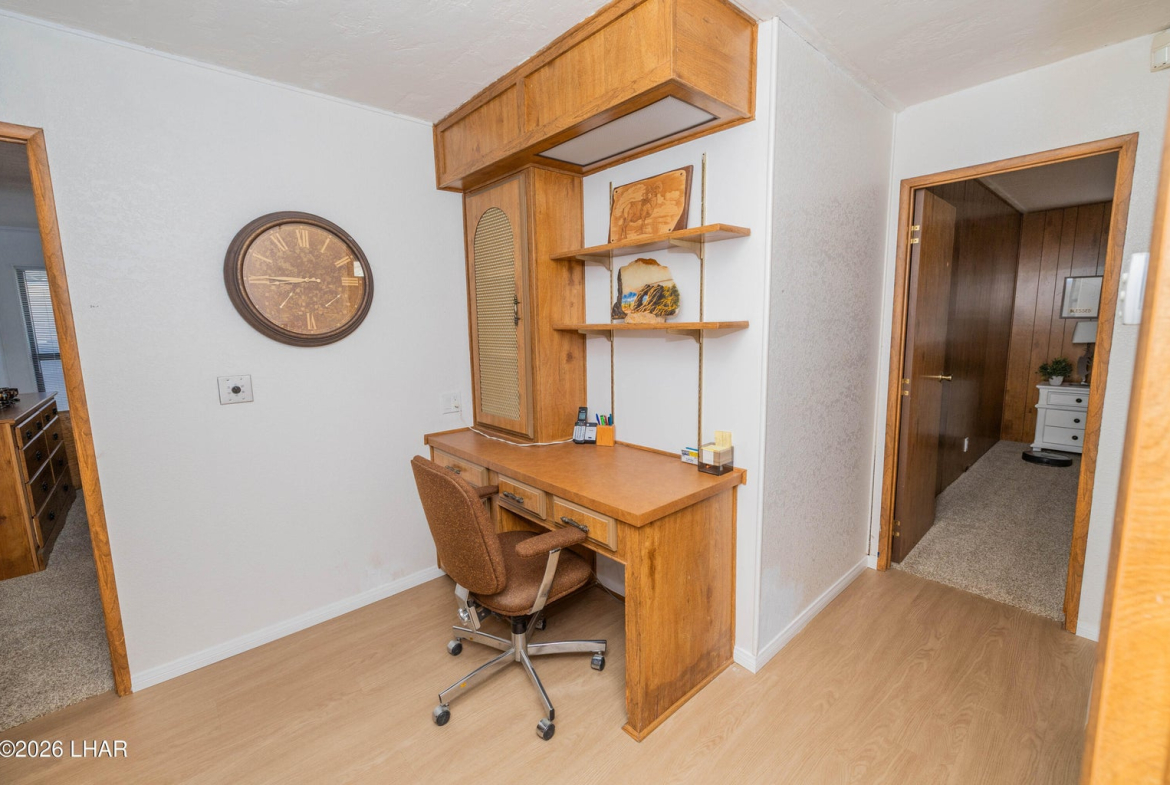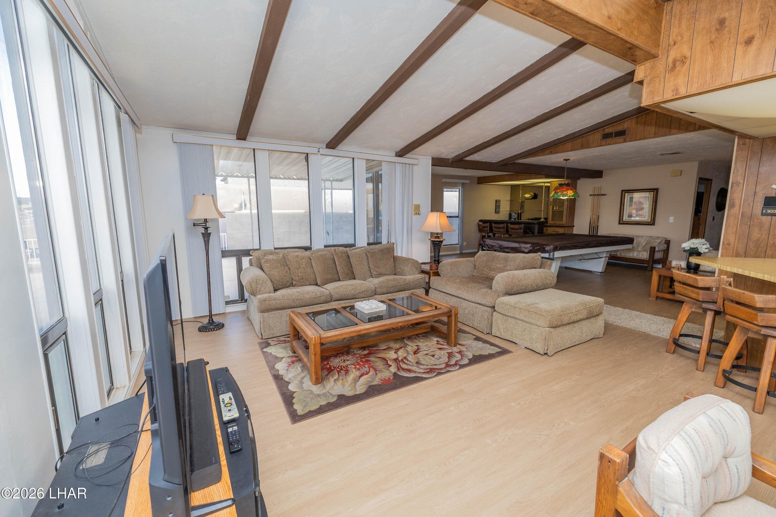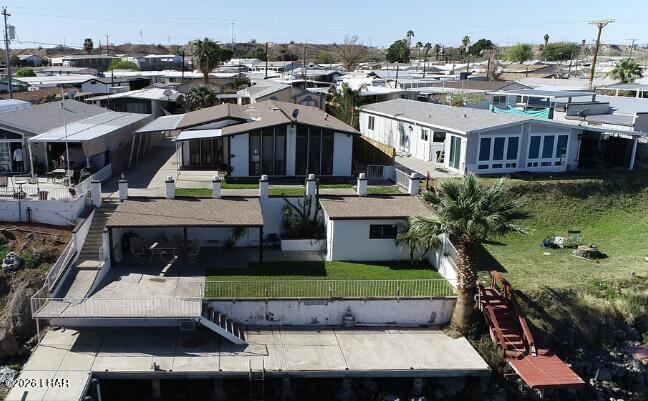 On leased land, this riverfront home offers stunning views of the river and mountains to enjoy from the floor to ceiling windows in the living room or from the two covered riverfront patios. Over 1900 square feet of living space this home comes completely furnished! An inviting open floor plan, spacious living room that is light and airy (and did I mention the views!), a wet bar with pool table makes it a perfect place for friends and family to gather and have fun after a day in the sun on the 60 foot private dock! Also included is a jet ski pad for easy river access, a dock to tie the boat up to and fish from and a utility room on the lower patio to store all your river gear! This home is in a gated community with amenities that include a club house, beach area, boat launch ramp, swimming pool and several common areas on the banks of the Colorado River!! No HOA and no property tax!! New AC installed in May of 2025.