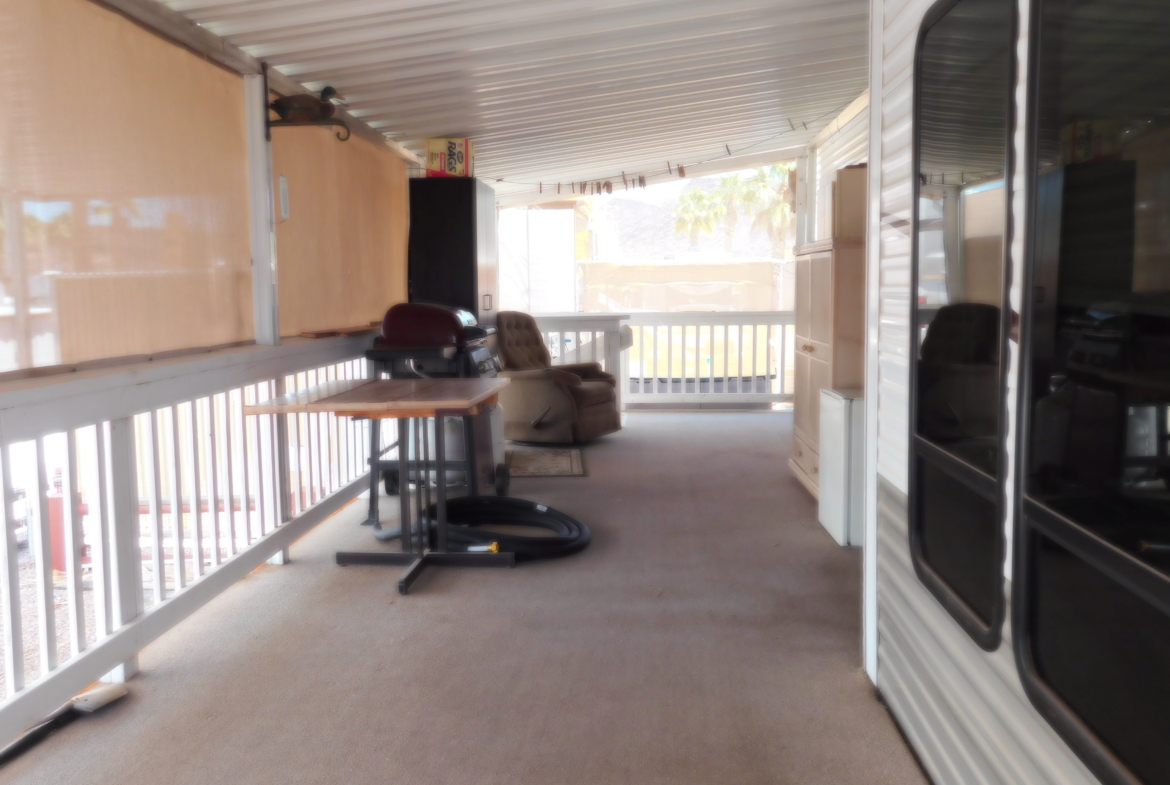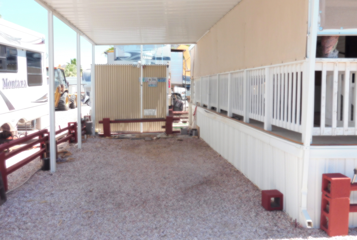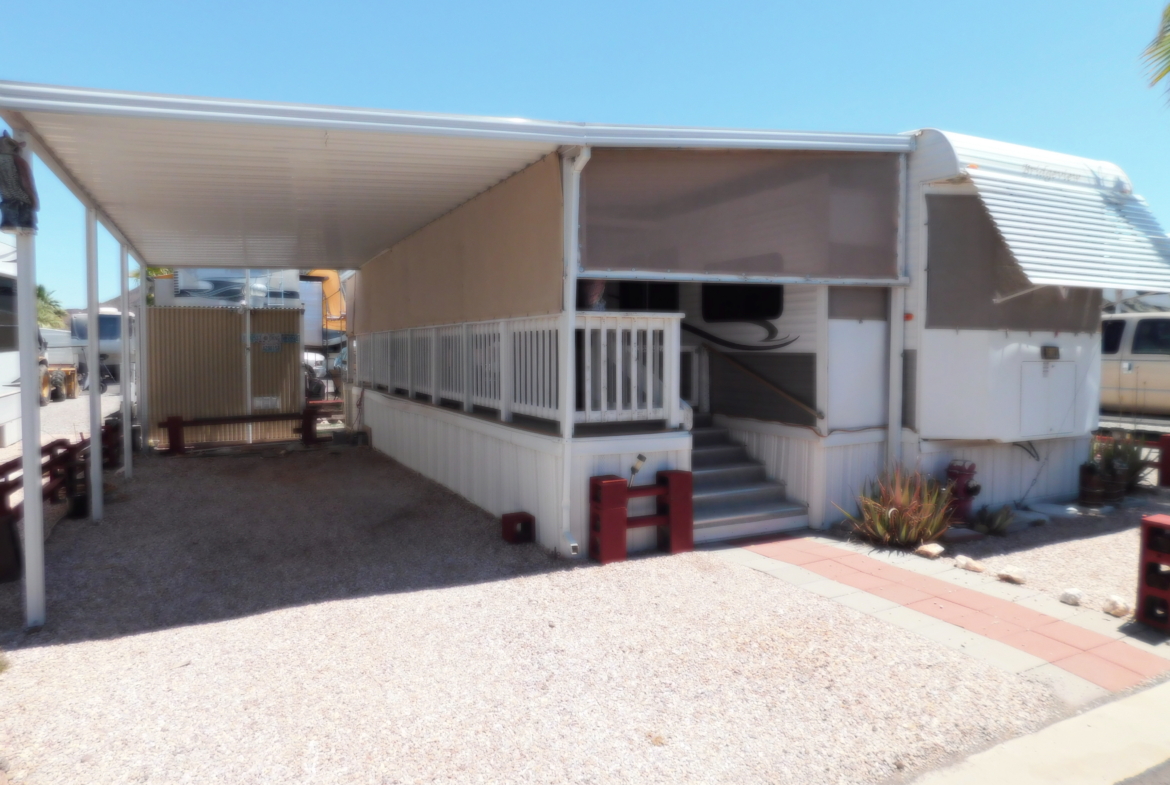 Looking for a place to spend your winters? Look no further. This turn-key 2010 Bridgeview 40 ‘ Park Model RV is move-in-ready; just bring your pajamas and toothbrush. The mobile has 3 slides providing a total of 364 sq. ft of living space. The kitchen is equipped with a large refrigerator, a new built-in microwave & hood, a kitchen island, and plenty of cupboards for storage, and counter space for kitchen projects. Enjoy the living room with a built-in electric fireplace and flat screen television. Its bay window has a metal awning to provide shade. The bedroom has plenty of closet space and storage, and a flat-screen television. A covered deck/patio is attached to the home for your outdoor relaxation. It comes with a propane grill, table, and drawers. A 10 X 20 carport is attached to the patio. A metal storage shed with shelves, and a smaller plastic garden shed are in the backyard. The park model is in the inviting Desert Gold RV Park. It provides many activities such as swimming pool & spa, miniature golf, horseshoes, game rooms, craft rooms. library, and exercise room to name a few. For the avid desert explore, the desert is accessible nearby.
