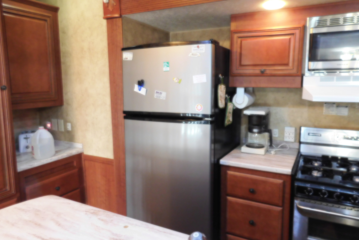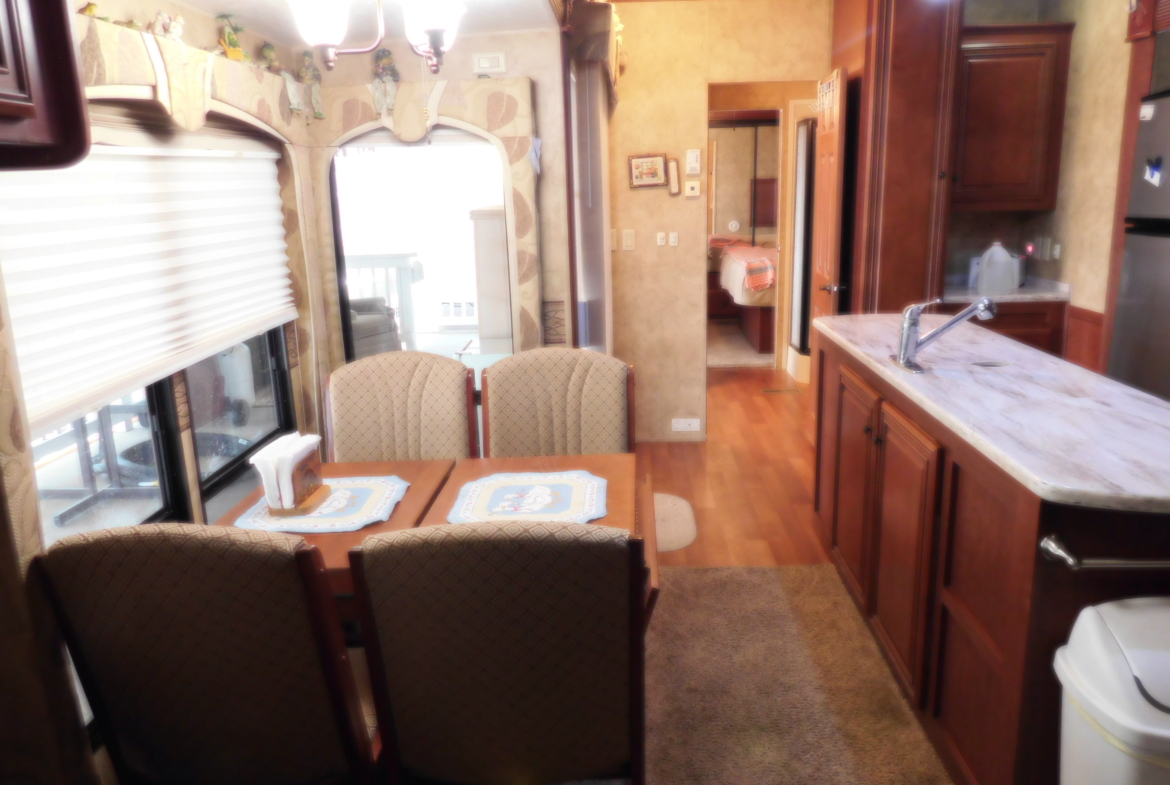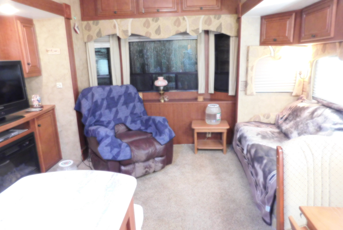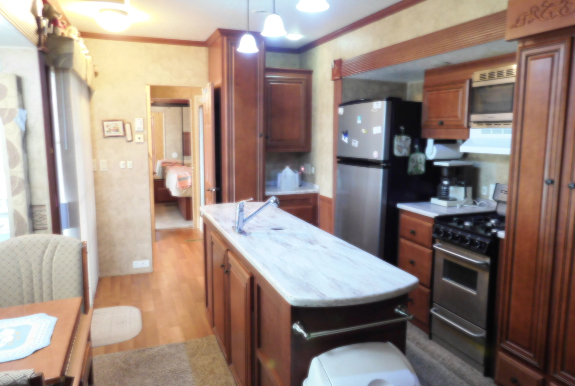 Looking for a place to spend your winters? Look no further. This turn-key 2010 Bridgeview 40 ‘ Park Model RV is move-in-ready; just bring your pajamas and toothbrush. The mobile has 3 slides providing a total of 364 sq. ft of living space. The kitchen is equipped with a large refrigerator, a new built-in microwave & hood, a kitchen island, and plenty of cupboards for storage, and counter space for kitchen projects. Enjoy the living room with a built-in electric fireplace and flat screen television. Its bay window has a metal awning to provide shade. The bedroom has plenty of closet space and storage, and a flat-screen television. A covered deck/patio is attached to the home for your outdoor relaxation. It comes with a propane grill, table, and drawers. A 10 X 20 carport is attached to the patio. A metal storage shed with shelves, and a smaller plastic garden shed are in the backyard. The park model is in the inviting Desert Gold RV Park. It provides many activities such as swimming pool & spa, miniature golf, horseshoes, game rooms, craft rooms. library, and exercise room to name a few. For the avid desert explore, the desert is accessible nearby.