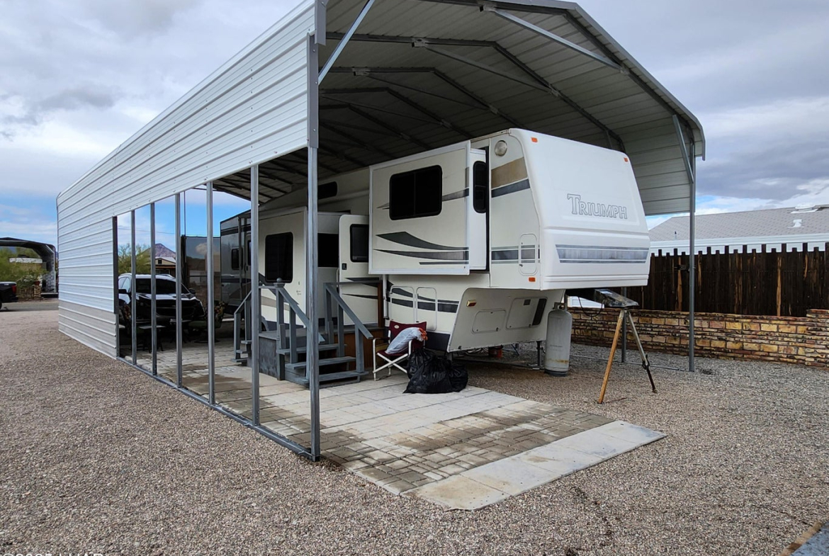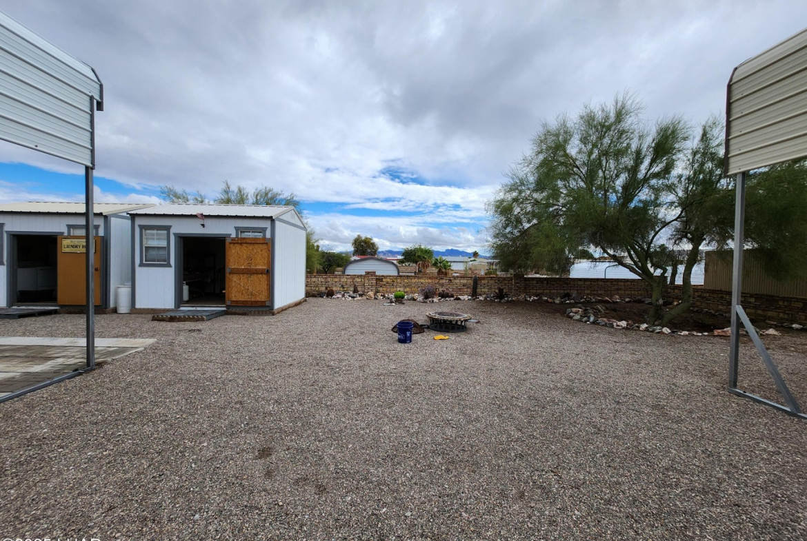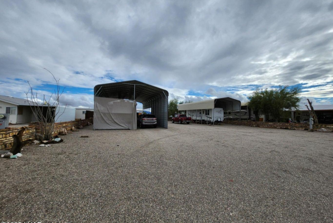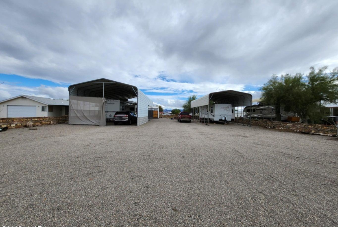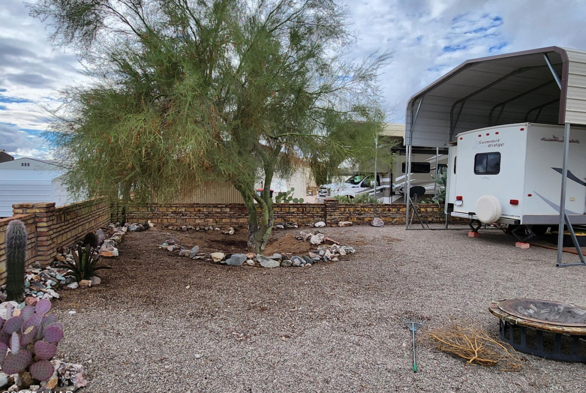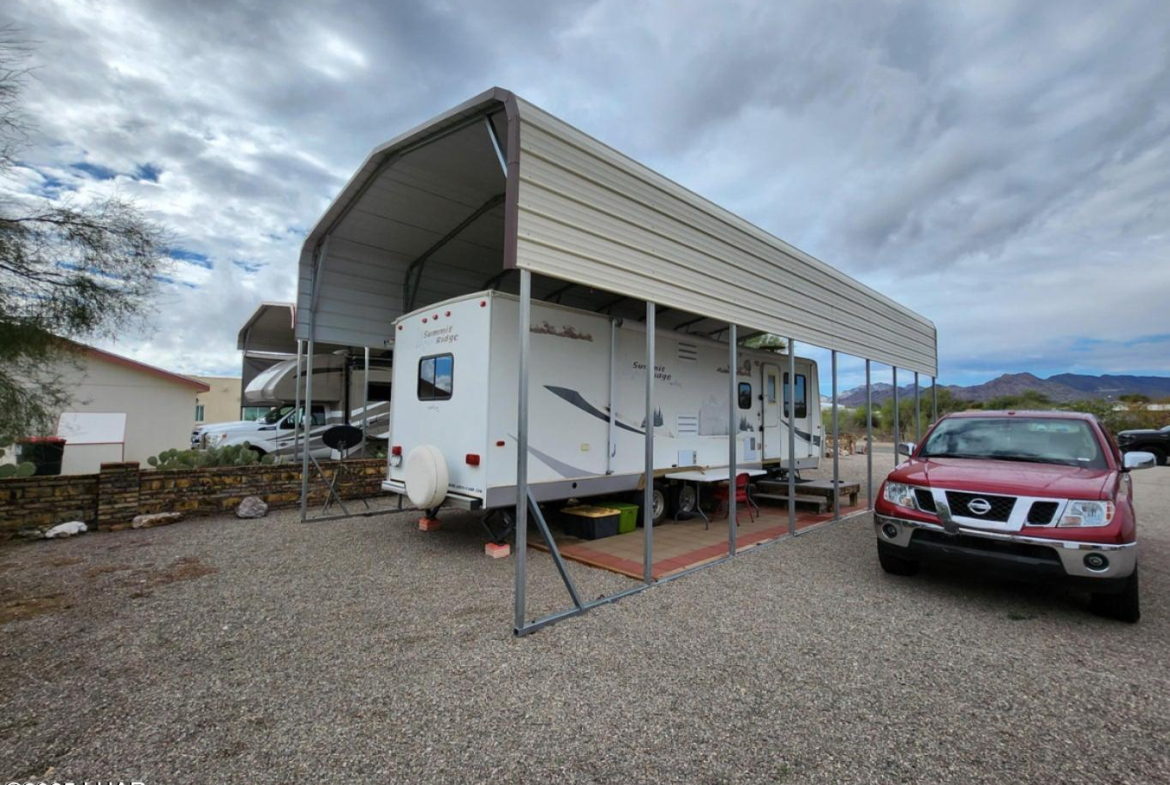 RV lot in Rainbow Acres with 2-50 amp full hookups, 40′ X 18′ RV cover and 51′ X 24′ RV cover, 2 sheds. 1 shed has laundry hookups and fridge and the appliances are included. The other shed has been used as the group dining area and also makes for good storage. No front wall or gates for ease of maneuverability for your rigs. Mature Palo Verde tree for shade. Both the 5th wheel and the trailer are available outside of escrow or will be removed. This lot was loved and enjoyed for years, now it’s your turn!