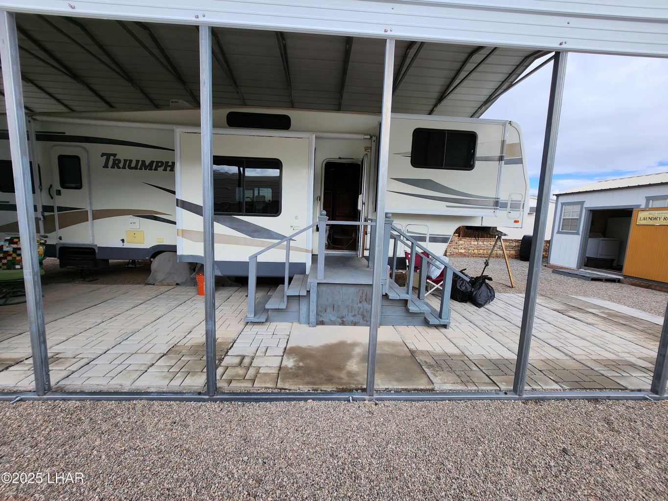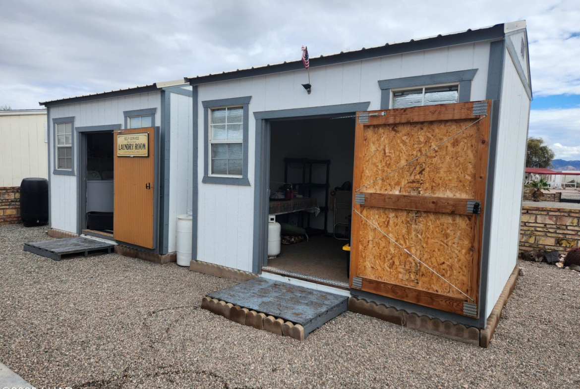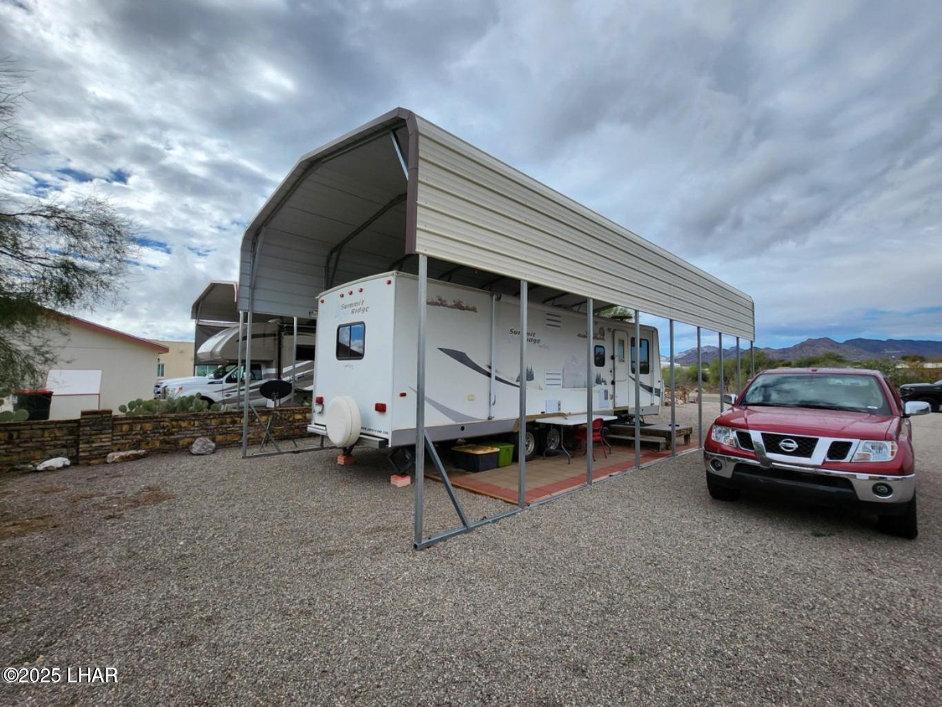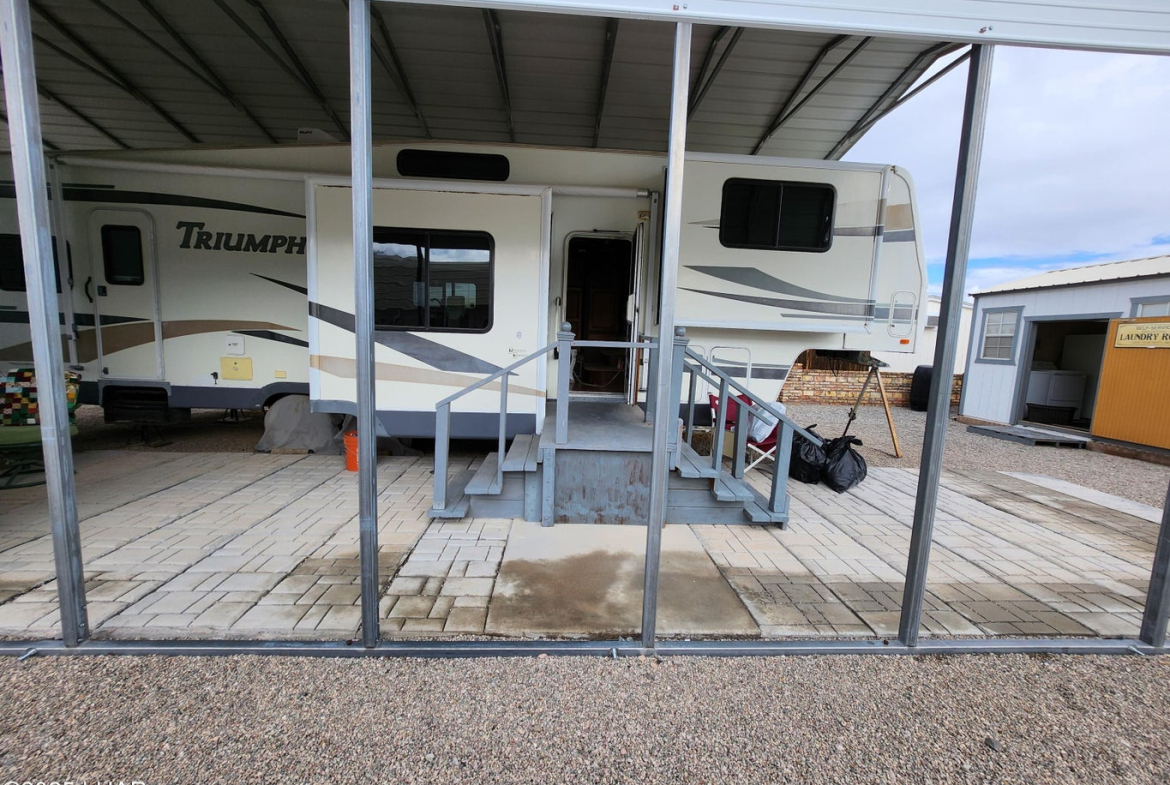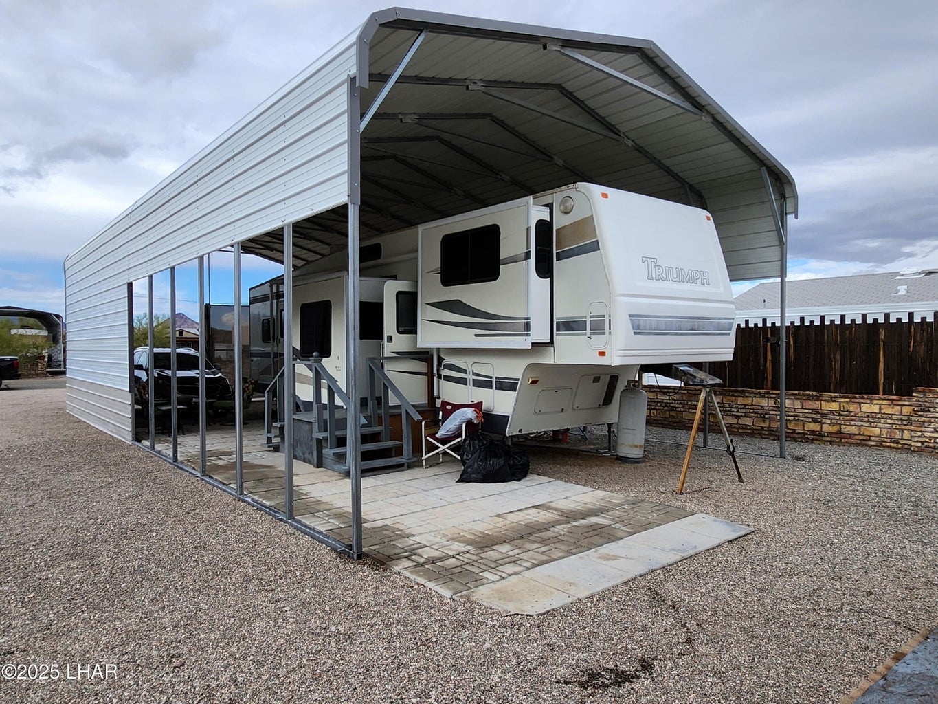 RV lot in Rainbow Acres with 2-50 amp full hookups, 40′ X 18′ RV cover and 51′ X 24′ RV cover, 2 sheds. 1 shed has laundry hookups and fridge and the appliances are included. The other shed has been used as the group dining area and also makes for good storage. No front wall or gates for ease of maneuverability for your rigs. Mature Palo Verde tree for shade. Both the 5th wheel and the trailer are available outside of escrow or will be removed. This lot was loved and enjoyed for years, now it’s your turn!
