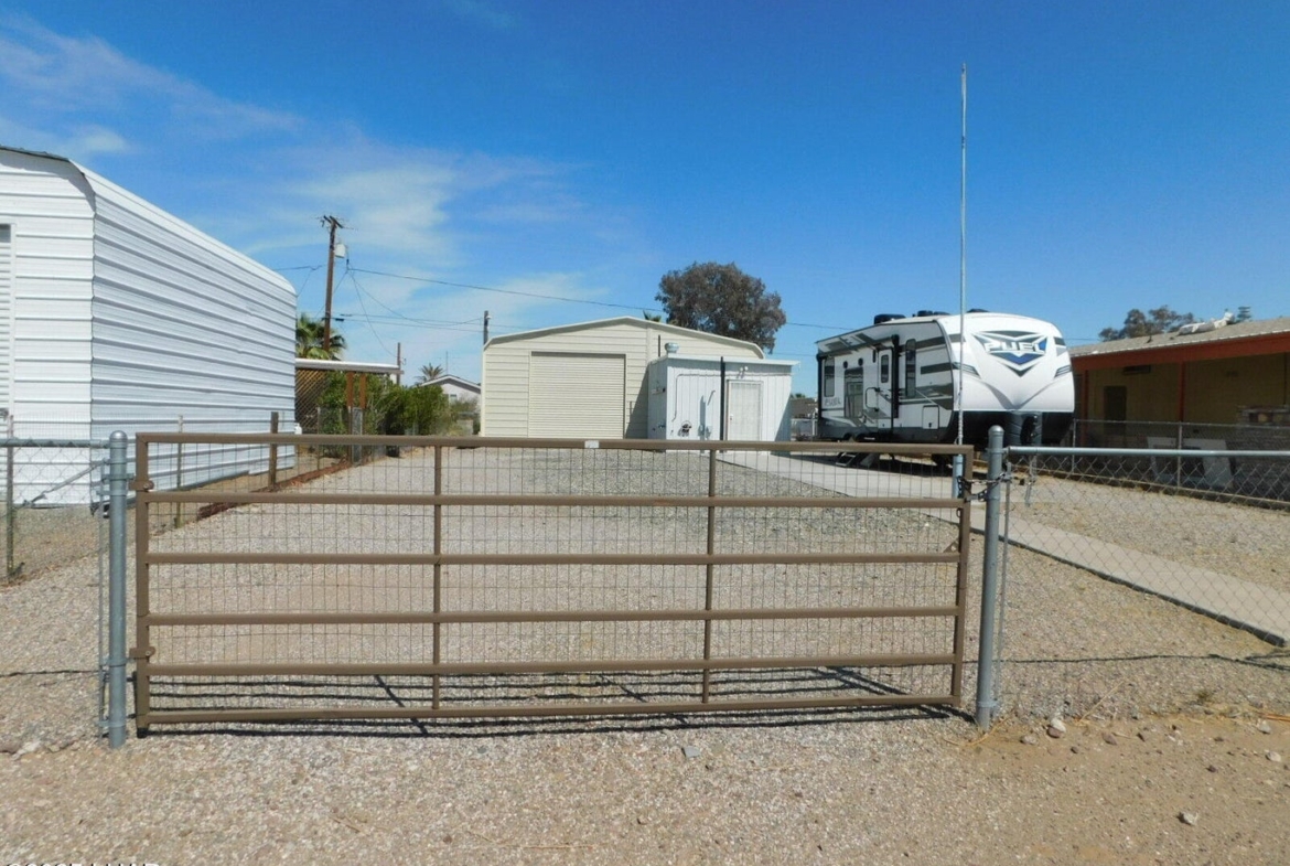 Nice little frame built 1 bedroom 1 bath home in the Town of Bouse. 3 lots each is 75×150 very clean. 40′ storage container and a good size shed with laundry hook up. Pride of ownership very apparent. Nicely landscaped. 2 window AC unit, swamp cooler and wall heater. Large covered patio on the front of the home. Shared well with 10 properties