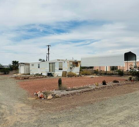 Nice little frame built 1 bedroom 1 bath home in the Town of Bouse. 3 lots each is 75×150 very clean. 40′ storage container and a good size shed with laundry hook up. Pride of ownership very apparent. Nicely landscaped. 2 window AC unit, swamp cooler and wall heater. Large covered patio on the front of the home. Shared well with 10 properties
